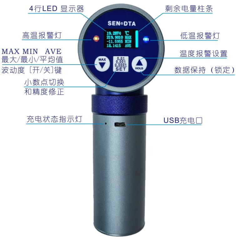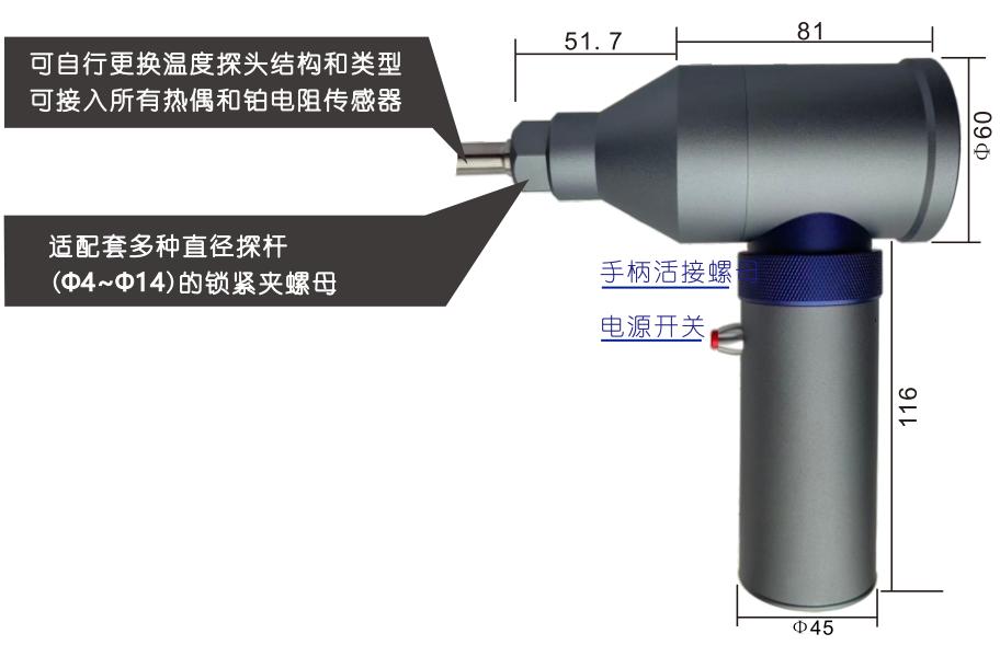 可拆卸的手柄内置5000mAh 锂电池,通用 USB充电口,外接电源持续测量。